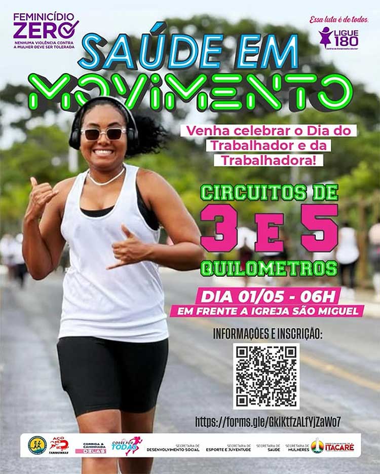 Saúde em Movimento! Dia 1º de maio Itacaré vai se reunir para celebrar o Dia do Trabalhador e da Trabalhadora com esporte, saúde e integração! Serão duas modalidades: 3km – corrida e caminhada exclusiva para participantes do Serviço de Convivência e Fortalecimento de Vínculos (CRAS); 5km – corrida ou caminhada aberta ao público. Concentração na Praça São Miguel, a partir das 06h | Largada às 07h.