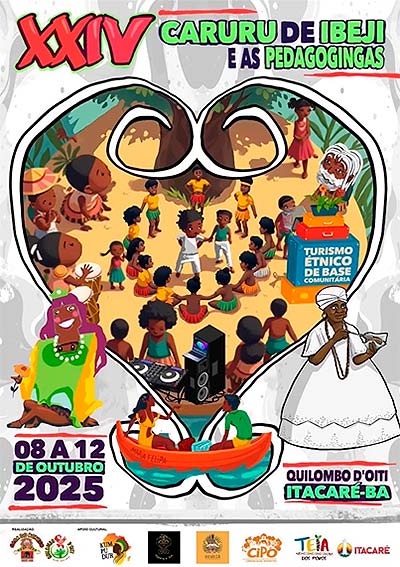 Toda a comunidade preta e originária está convidada para o XXIV Caruru de Ibeji e as Pedagogingas, de 08 a 12 de outubro no Quilombo D’Oiti. Com o tema “Turismo Étnico de Base Comunitária”, o objetivo do encontro deste ano será discutir a autonomia econômica das comunidades negras, a partir de um conceito que visa a valorização cultural e o desenvolvimento local.