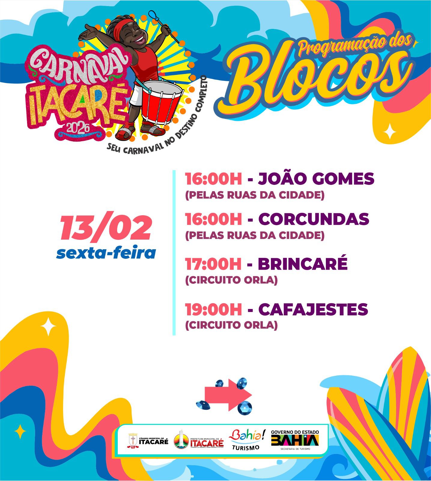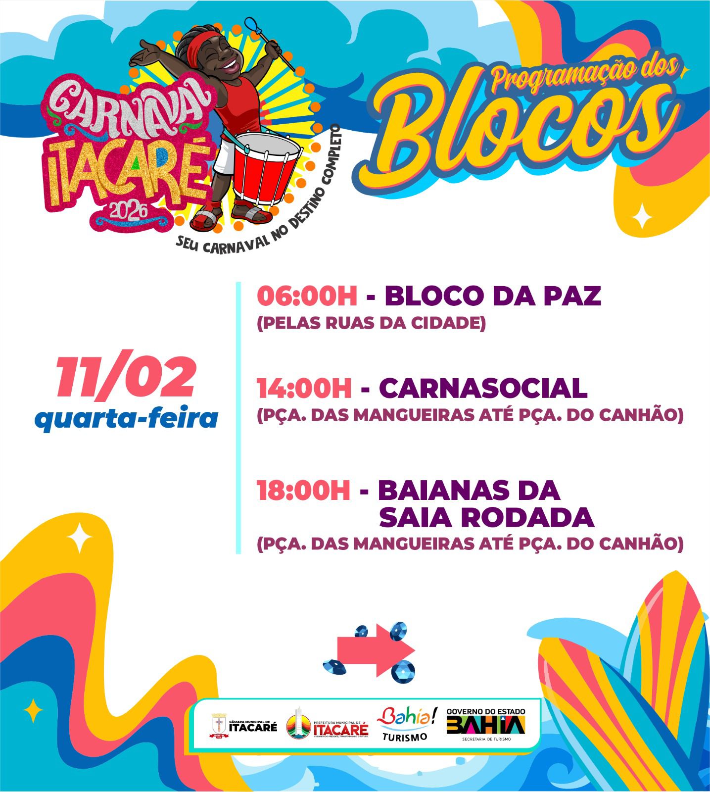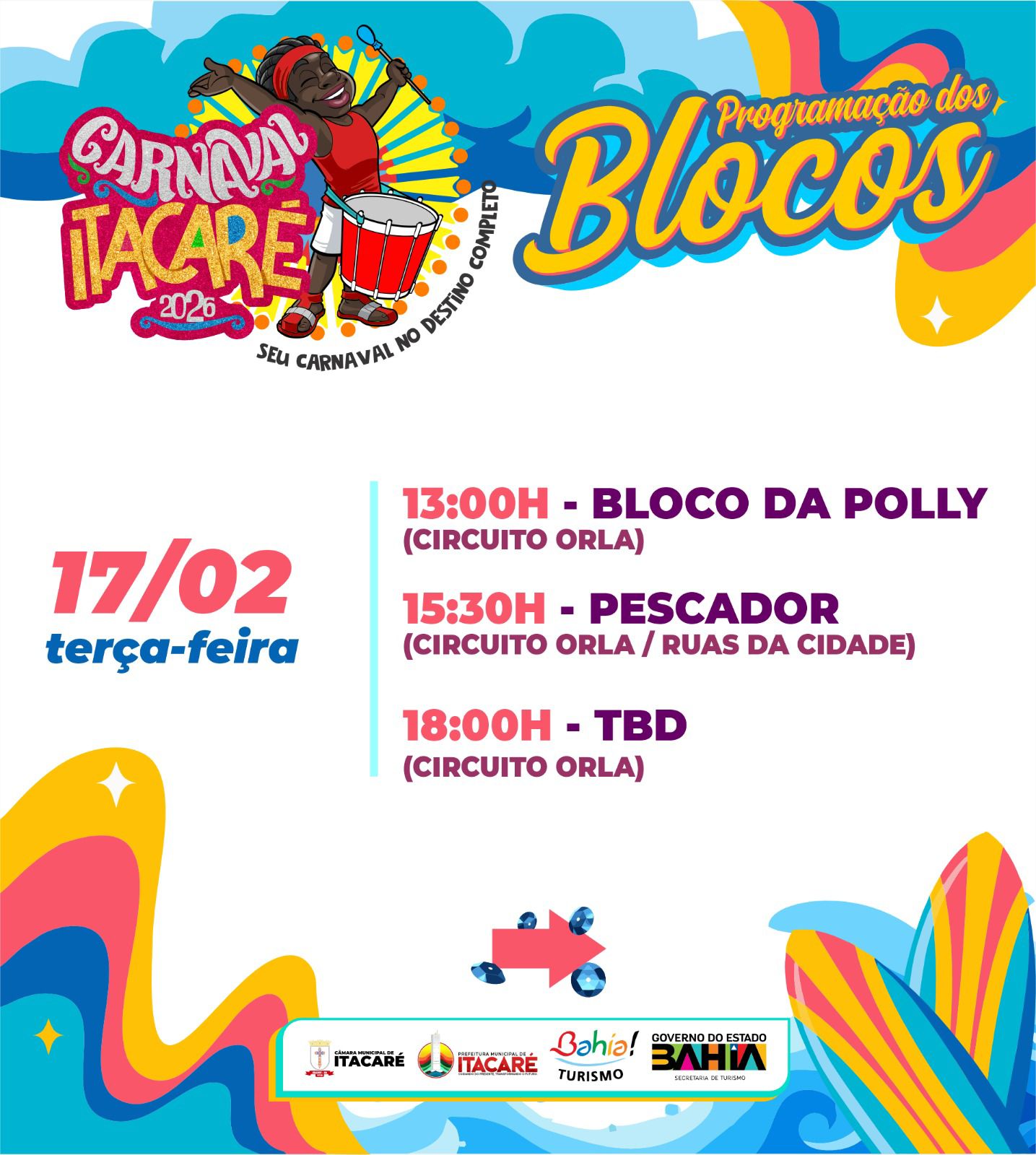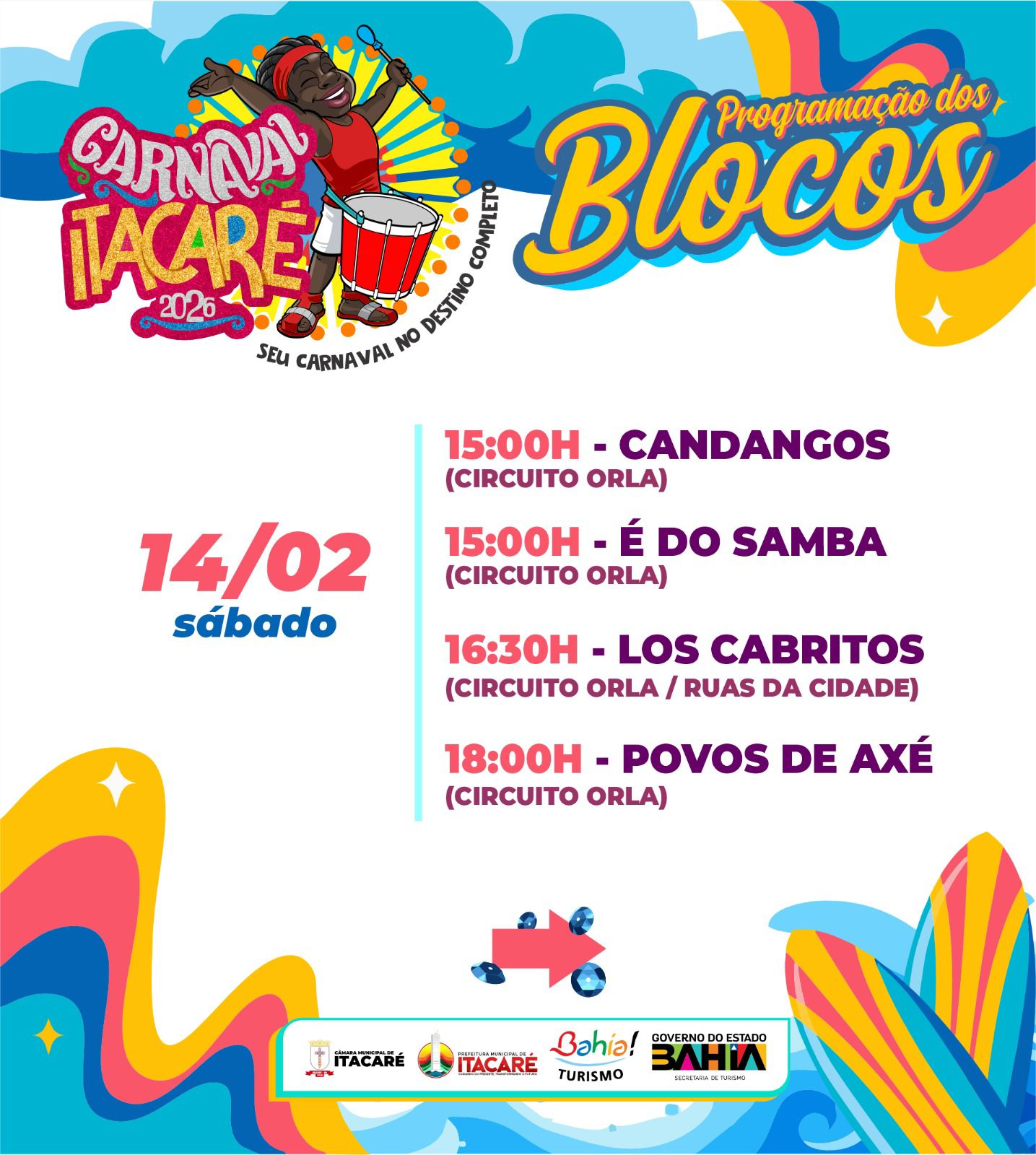 Quem é de bloco, já tá pronto?! A alma do Carnaval de Itacaré é a gente na rua! A programação oficial dos blocos saiu e tá do jeito que todo mundo gosta: muita diversidade, percussão e alegria tomando conta da avenida. Seja de abadá, fantasiado ou na pipoca, o importante é seguir o som! Vem ver o horário dos blocos e programe-se!
