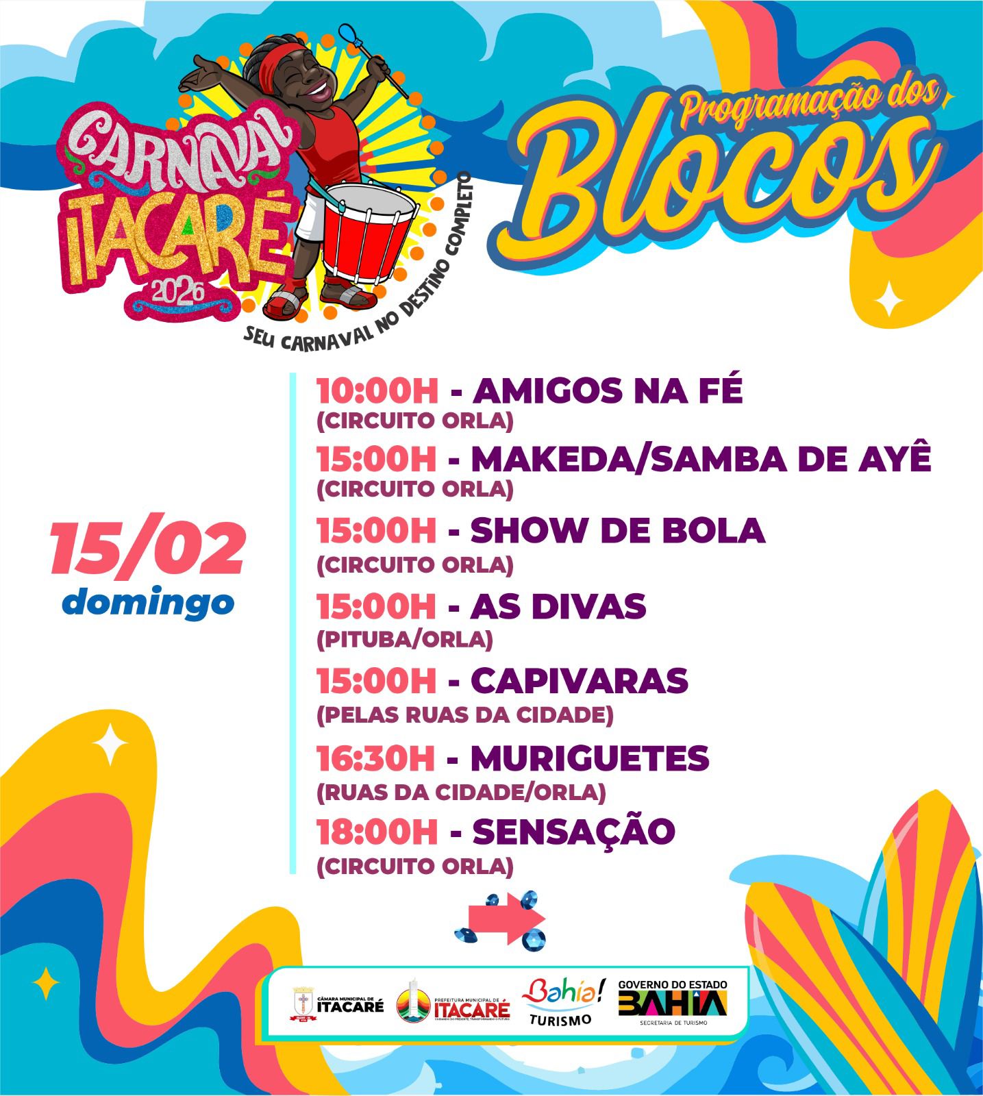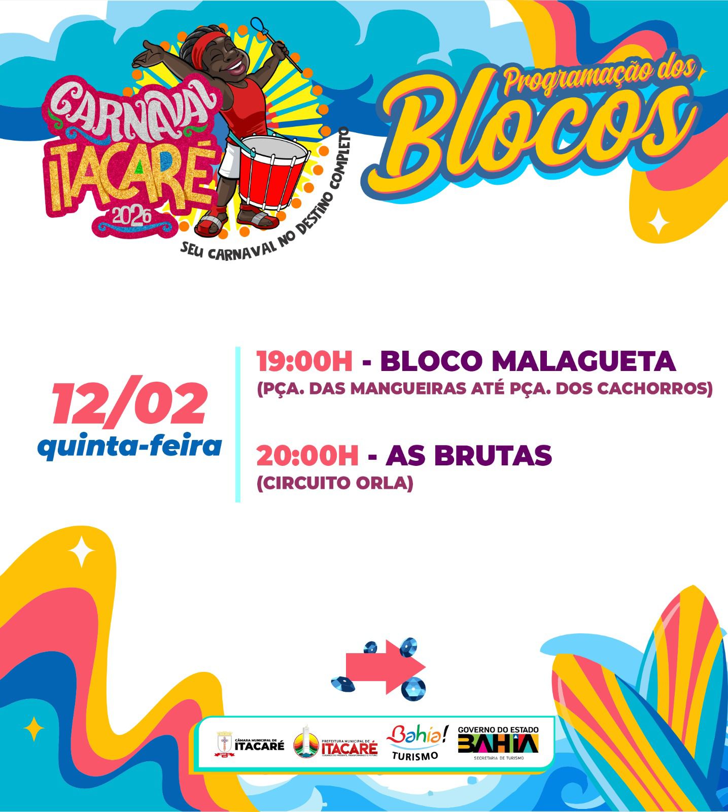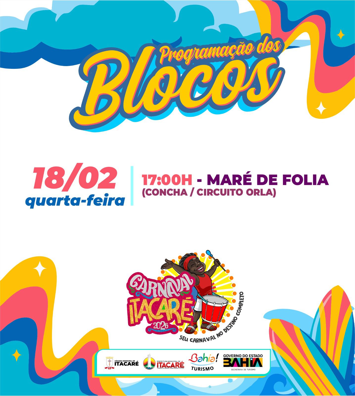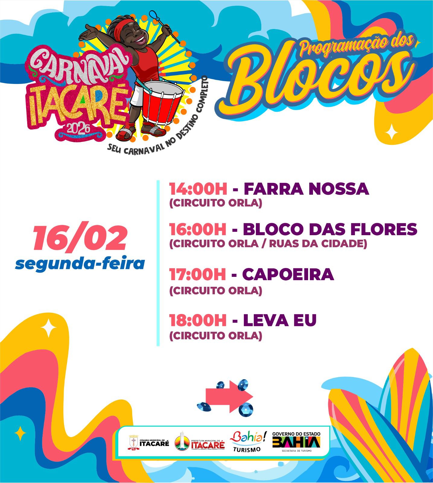 Quem é de bloco, já tá pronto?! A alma do Carnaval de Itacaré é a gente na rua! A programação oficial dos blocos saiu e tá do jeito que todo mundo gosta: muita diversidade, percussão e alegria tomando conta da avenida. Seja de abadá, fantasiado ou na pipoca, o importante é seguir o som! Vem ver o horário dos blocos e programe-se!