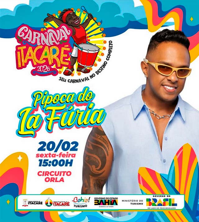 Presta atenção e anota na agenda! A puxada que seria realizada na quarta-feira de cinzas foi transferida para sexta-feira. Então é isso: dia 20/02 tem Pipoca da La Fúria na Orla de Itacaré, a partir das 15h. A energia continua a mesma, só mudou o dia! Bora fechar a programação do Carnaval de Itacaré com muita animação na orla!