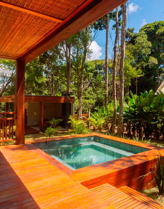 Agora olha isso… uma jacuzzi maravilhosa, revestida em madeira, no meio desse paraíso. Já imaginou relaxar aqui depois de um dia de praia?