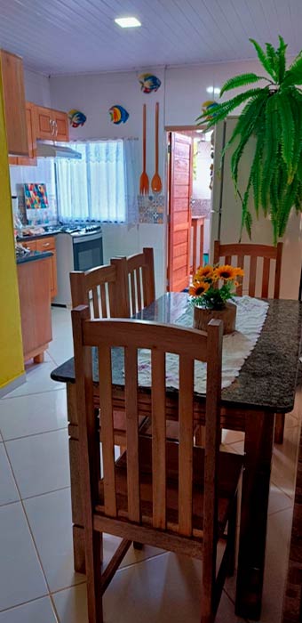 Casa com dois quartos com ventiladores, sendo uma suíte, 2 banheiros, sala, cozinha completa, TV com antena Oi, área de serviço, estacionamento, área de churrasco e ducha. A 200 metros da praia.