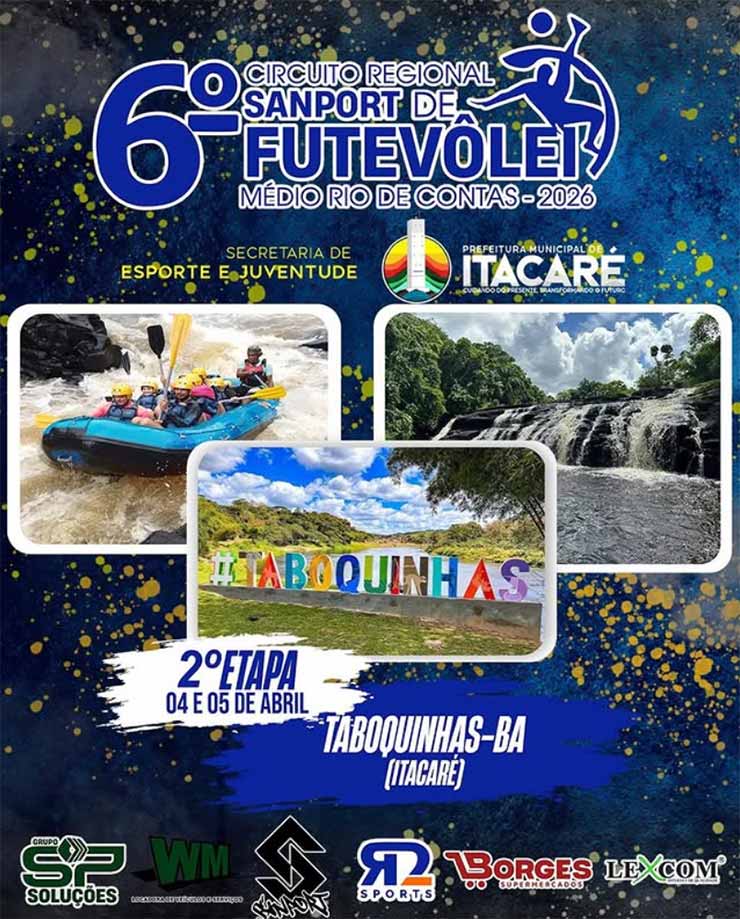 Taboquinhas no centro do futevôlei baiano! Neste final de semana, 04 e 05/04, Taboquinhas será palco de grandes emoções com a realização da 2ª etapa do Circuito Regional de Futevôlei. O evento já está consolidado como um dos maiores do estado da Bahia reunindo atletas de alto nível e promovendo o crescimento da modalidade. São mais de 120 duplas e trios, representando cerca de 50 cidades baianas.