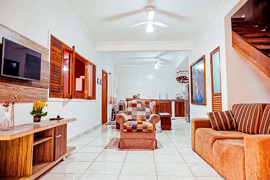 Confortable house for holiday rentals with 5 bedrooms, being 2 with bathrooms, with air-conditioner in 4 bedrooms. Mezzanine with TV room, full kitchen, laundry, more 2 bathrooms. Good location, near of the sea.Condomínio Xandó – Rodovia Ilhéus/Itacaré. Vila do Sargi