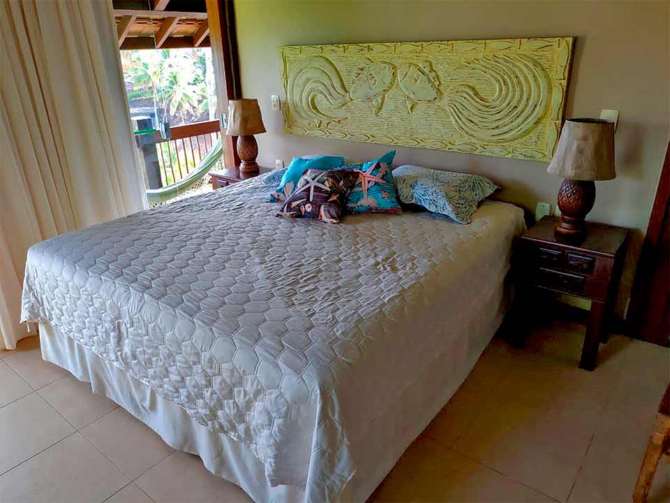 House retreat conveniently located in the tropical forest yet within the confinement of the village. 3 suites with air conditioner or ceiling fans. Beds for 9 persons. Private balconies and bathrooms in each of the suites. Chef’s kitchen with indoor/outdoor bar and center island. Spacious garden with deck and swimming pool. Wi-Fi.TV. Safe deposit box. Bbq. Private parking.Rua Amendoeira - Concha