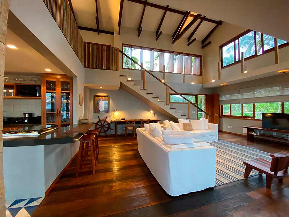 House retreat conveniently located in the tropical forest yet within the confinement of the village. 3 suites with air conditioner or ceiling fans. Beds for 9 persons. Private balconies and bathrooms in each of the suites. Chef’s kitchen with indoor/outdoor bar and center island. Spacious garden with deck and swimming pool. Wi-Fi.TV. Safe deposit box. Bbq. Private parking.Rua Amendoeira - Concha