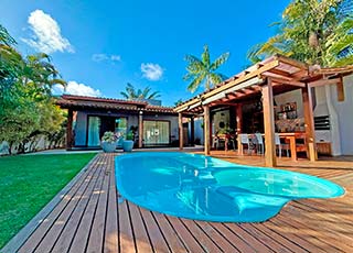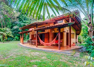 House retreat conveniently located in the tropical forest yet within the confinement of the village. 3 suites with air conditioner or ceiling fans. Beds for 9 persons. Private balconies and bathrooms in each of the suites. Chef’s kitchen with indoor/outdoor bar and center island. Spacious garden with deck and swimming pool. Wi-Fi.TV. Safe deposit box. Bbq. Private parking.Rua Amendoeira - Concha