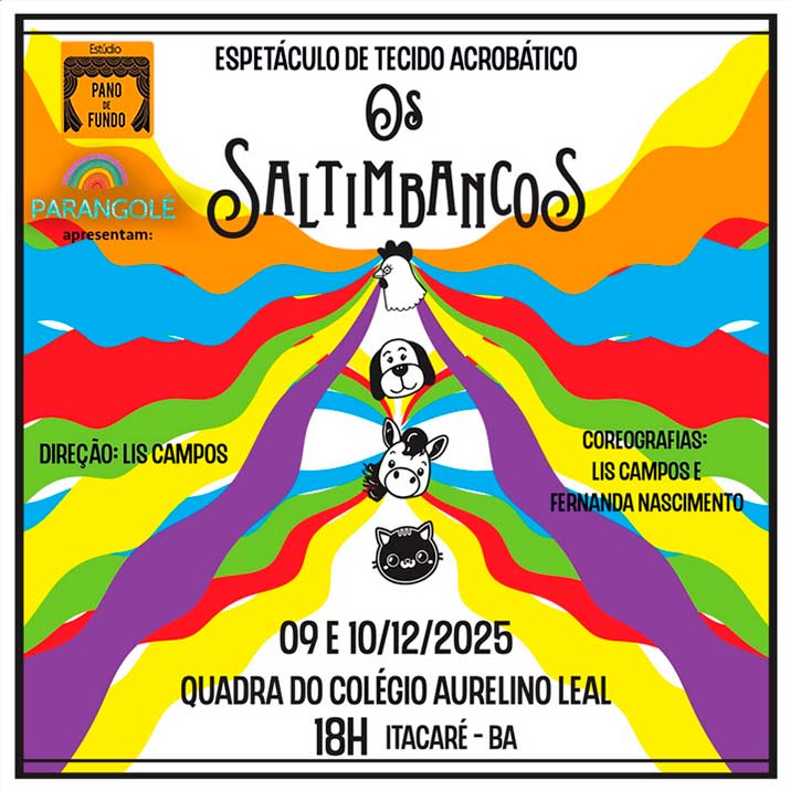 No alto dos tecidos, entre danças e risadas, surge um grupo de animais sonhadores que decide mudar o próprio destino. O espetáculo Os Saltimbancos mistura tecido acrobático, dança e teatro para contar, com leveza e alegria, uma história sobre liberdade, amizade e coragem. Apresentações dias 9 e 10 de dezembro de 2025 na Quadra da Escola Estadual Aurelino Leal. Entrada gratuita.