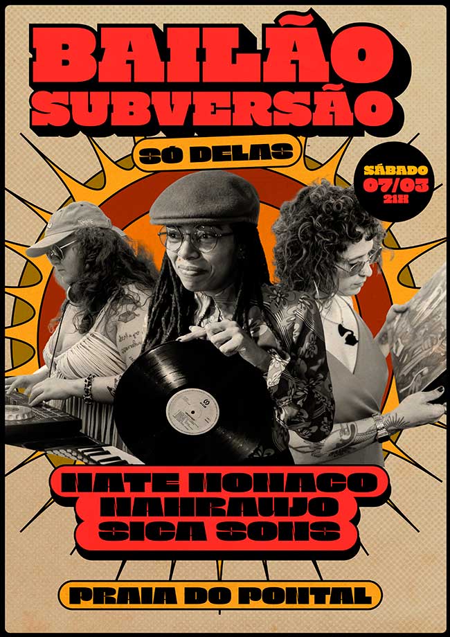 Bailão Subversão na Praia do Pontal convida as deejays mais brabas da cena para esta noite especial "Só Delas". Nate Monaco + Nahraujo + Sica Sons discotecando com muita brasilidade (Afrofunk, Rap, Samba, Rock Doido, Funk Carioca) e sons Sulamefricanos (Afrobeat, Reggaeton, Cumbia, Dembow, Dancehall), com o BPM lá em cima para fazer a pista pegar fogo nesta edição repleta de suingue.